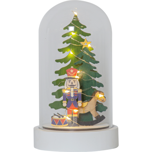 En nøddeknækker hører julen til, og selvom det er en tysk tradition, så har vi også taget traditionen til os her i Danmark. Denne flotte laserskåret nøddeknækker figur i træ kommer i en lille glaskuppel og er malet i de flotteste farver. En ekstra lille f
